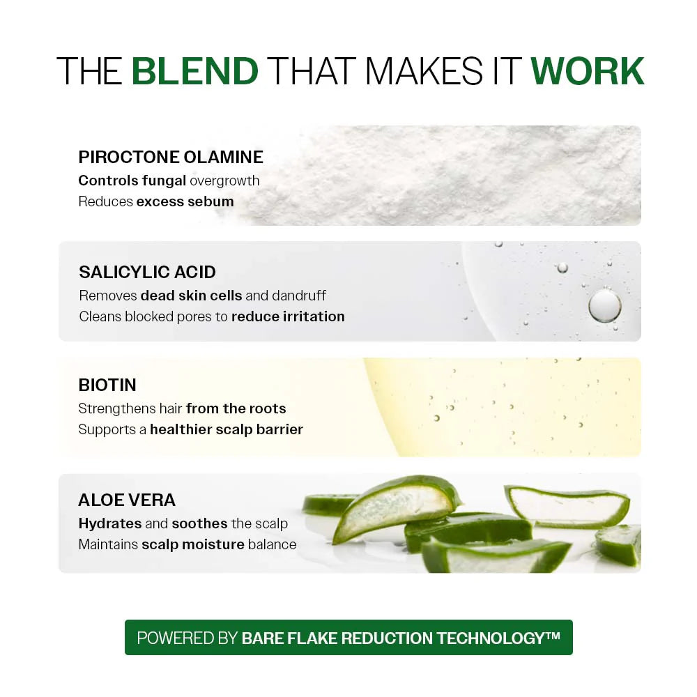 Formulated with Salicylic Acid, Piroctone Olamine, and Biotin, this advanced shampoo gently exfoliates flaky buildup, targets dandruff-causing microbes, and strengthens hair from the roots—without over-drying or stripping natural oils. Ideal for regular use, it restores scalp comfort while leaving hair clean, soft, and refreshed.