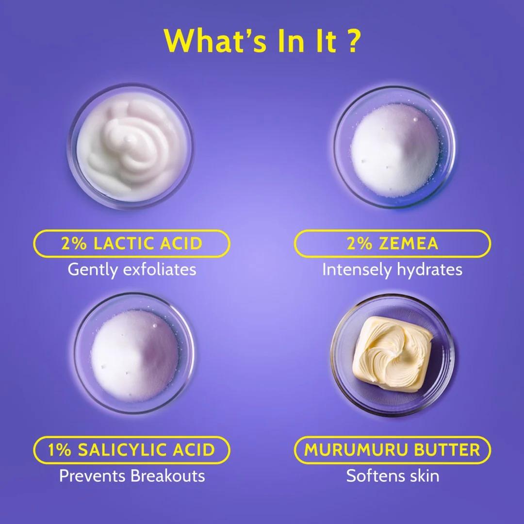 The Chemist at Play Exfoliating Body Wash is a gentle yet effective solution for dull, rough, or bumpy skin. Powered with 1% Salicylic Acid, 2% Lactic Acid, Ceramides, Vitamin E and Murumuru Butter, this body wash for women & men exfoliates dead skin, unclogs pores, fades tan and leaves your skin soft and hydrated. Whether you're dealing with strawberry legs, body acne, or sun-induced dullness, this tan removal body wash offers visible results with every wash.