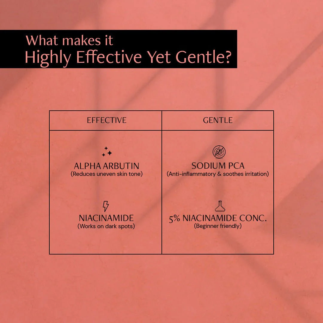 Meet the 4-in-1 multibenefit serum that works tirelessly to fade dark spots, pigmentation, acne marks, and tanning—all while strengthening your skin barrier. Powered by 5% Niacinamide and 2% Alpha Arbutin, this gentle yet effective formula targets uneven skin tone at its root, soothes irritation, and boosts hydration. Lightweight, non-sticky, and free from irritants, it’s the perfect beginner-friendly serum for daily use. Whether you’re dealing with sun damage, post-acne scars, or dullness, this serum helps you reveal a smooth, even, and radiant complexion.