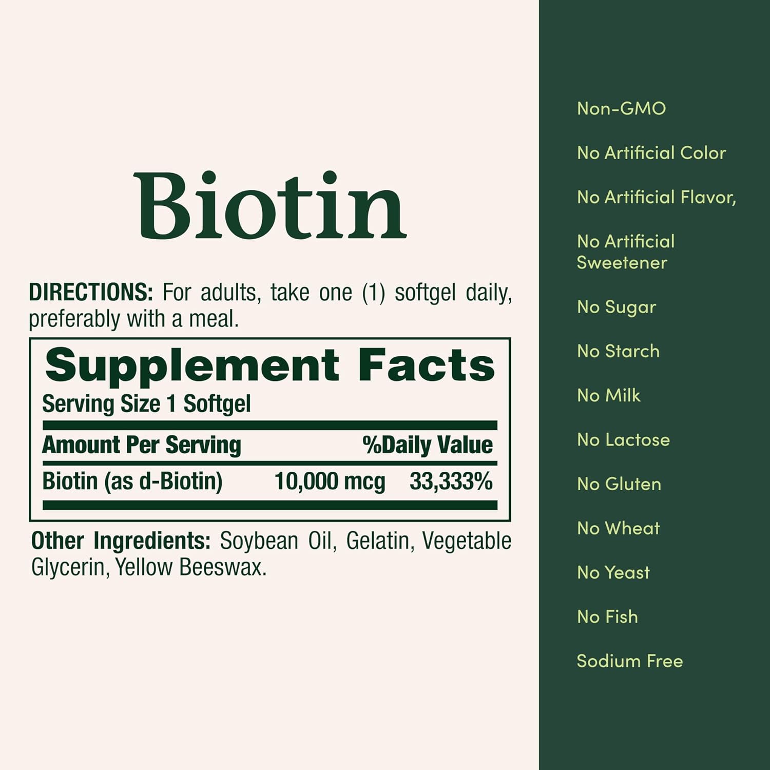 Nature's Bounty Biotin offers an exceptional solution for those seeking hair, skin and nail support for women and men.(1) With 10,000 mcg in rapid release softgels, Nature's Bounty Biotin softgels support beautiful hair, radiant skin, and healthy nails.(1) The powerful Nature’s Bounty vitamin for men and women are formulated to aid in the conversion of nutrients into cellular energy.(1) Additionally, biotin contributes to supporting a healthy nervous system, all while being a part of the comprehensive B Family of vitamins.(1) Whether you seek hair, skin and nails vitamins for women, or simply wish to enhance your beauty routine with quality biotin pills, these Nature's Bounty softgels are the ideal choice.(1) Free from GMOs, gluten, sugar, and artificial flavors, or sweeteners, each dose is tailored to meet your specific dietary preferences. Experience the benefits of biotin with Nature's Bounty, rooted in 50 years of dedication to quality, scientific research, and excellence in nutritional supplements. Embrace your journey to look and feel your best with these expertly formulated vitamins.