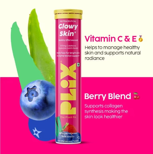 Glow from within with the Plix Glowy Skin Bubbly Effervescent Tablets, a delicious and refreshing daily drink infused with 500 mg L-Glutathione, Hyaluronic Acid, and a Berry Blend packed with Vitamin C & E. This antioxidant-rich formula helps manage uneven skin tone, supports deep hydration, and promotes overall skin health — giving you that lit-from-within glow.
